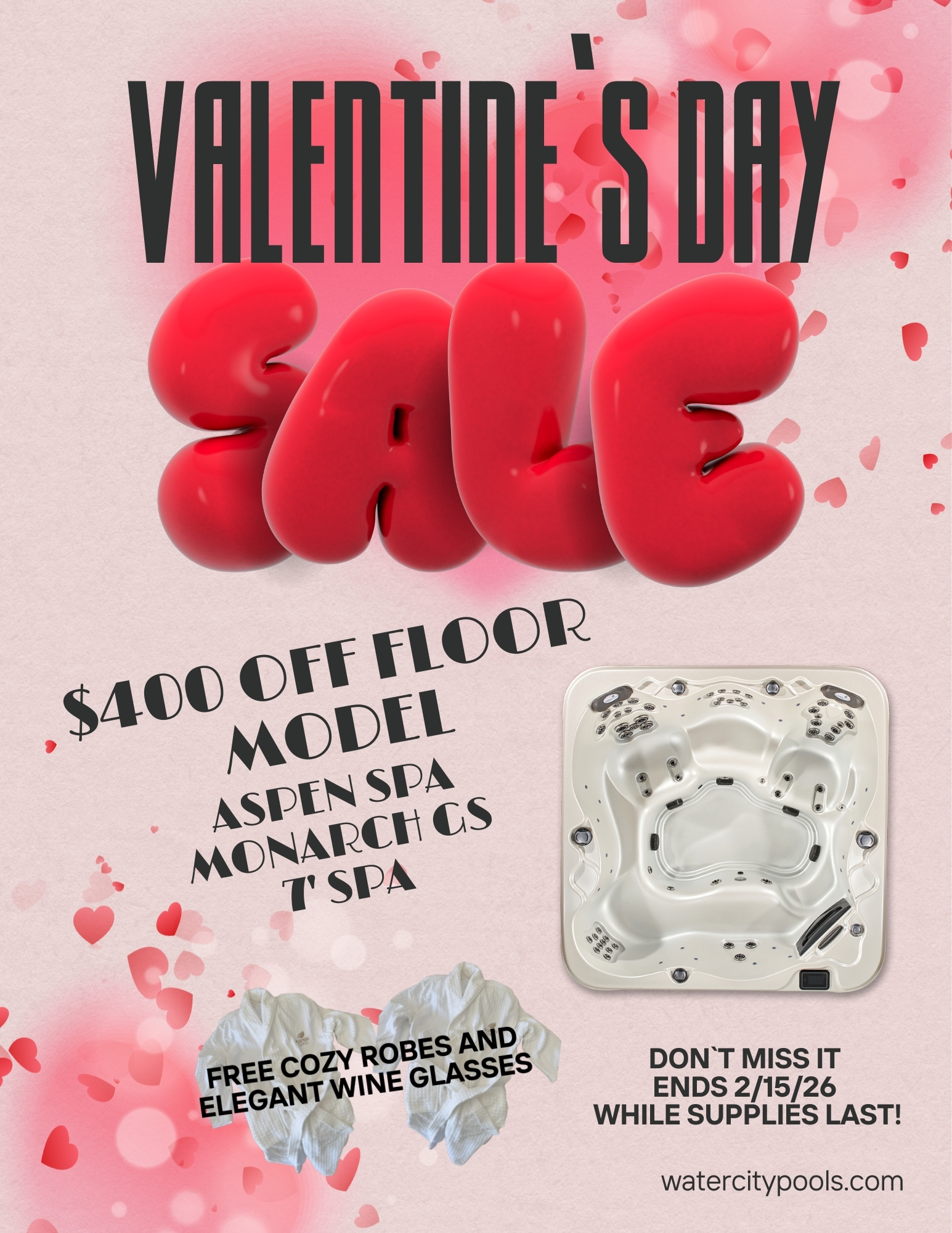 Treat your loved one (and yourself!) this Valentine’s Day with the gift of year-round relaxation. Our special promotion features the luxurious Aspen Monarch GS 7′ Spa, complete with powerful jets for an unparalleled hydrotherapy massage. Perfect for couples who love to unwind in style. This limited-time offer includes a generous $400 discount off the purchase price, plus a set of two plush robes and matching wine glasses absolutely free, adding the perfect touch of comfort and romance to your new backyard oasis.